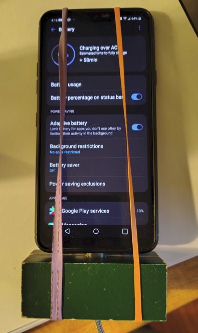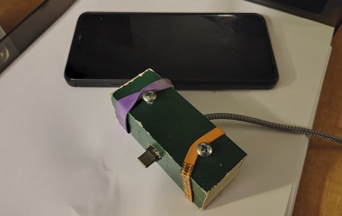 Shockingly, I don’t enjoy jamming a USB connector into a phone by hand for three hours. I tried wrapping a rubber band around the connector and stretching the other end over the top of the phone. Close, but the connector deflects and the force vectors don’t line up well enough to create the requisite electrical connection. Undeterred, I devised this sexy little contraption to make everything line up: