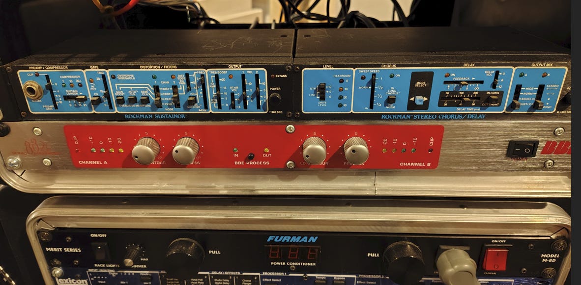 A few years after I graduated, while finishing a masters degree in applied physics for no real reason other than “why not”, I found myself immersed in the world of home studio recording. And of course, that too became as much about building stuff as recording stuff. I designed a nifty and rather large equipment rack on wheels. I’d show it to you, but smartphones didn’t exist and I didn’t own a camera back then. I wish I had a picture of it, as it was another masterpiece of form and function. It was six or seven feet high and housed two large semipro tape decks and a bunch of rack-mountable electronic gizmos. In a moment of temporary insanity, I traded it to a friend for two “Rockman” effects units. The Rockmans’ main claim to fame is that they make you sound like Boston — or more accurately, like Tom Scholz, their lead guitar player. Scholz was a fellow mechanical engineer from MIT; he invented the Rockman series. They’re the blue things in this photo: