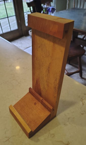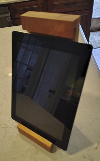 Fun postscript: I discovered about half a dozen of them in a box a few weeks ago. Seeing no value, and with my youthful hoarding tendencies now dissolving like sugar in tea, they were headed to the trash. In one of those flashes of synchronous serenity that reeks of teleology, my daughter happened to be pulling into the driveway. I said, “Hey, I made these forty years ago, you want one?” She took two. A third is now in the kitchen. Why Tom, why? Well, as my daughter pointed out, they have broader potential. The artist in her immediately perceived a portable easel for smaller projects. But they also make great tablet holders. Thus, one has a new lease on life as a recipe display on the kitchen island. Here it is: