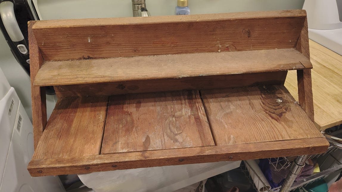 A couple years later I decided to redeem myself. I was bored and found myself once again rummaging through spare ends of wood in my parents’ utility room — mostly small lengths of 2x10 and millwork that you find in the garages of tool owners. And for some reason I decided to build a shelf. I can’t explain it. I didn’t need a shelf at the time — I was eight or nine years old, and shared a small bedroom with a much older sibling who ruled with an iron fist. There was no place for a shelf. But I was determined. Failure was not an option this time. So I built a shelf, which, for reasons that only the Lord above knows, I still own. Here it is: