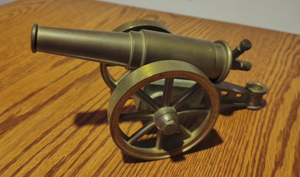 The rest of my college handiwork is too embarrassing to discuss, and shall never be mentioned in print. That toy brass cannon will be my legacy.